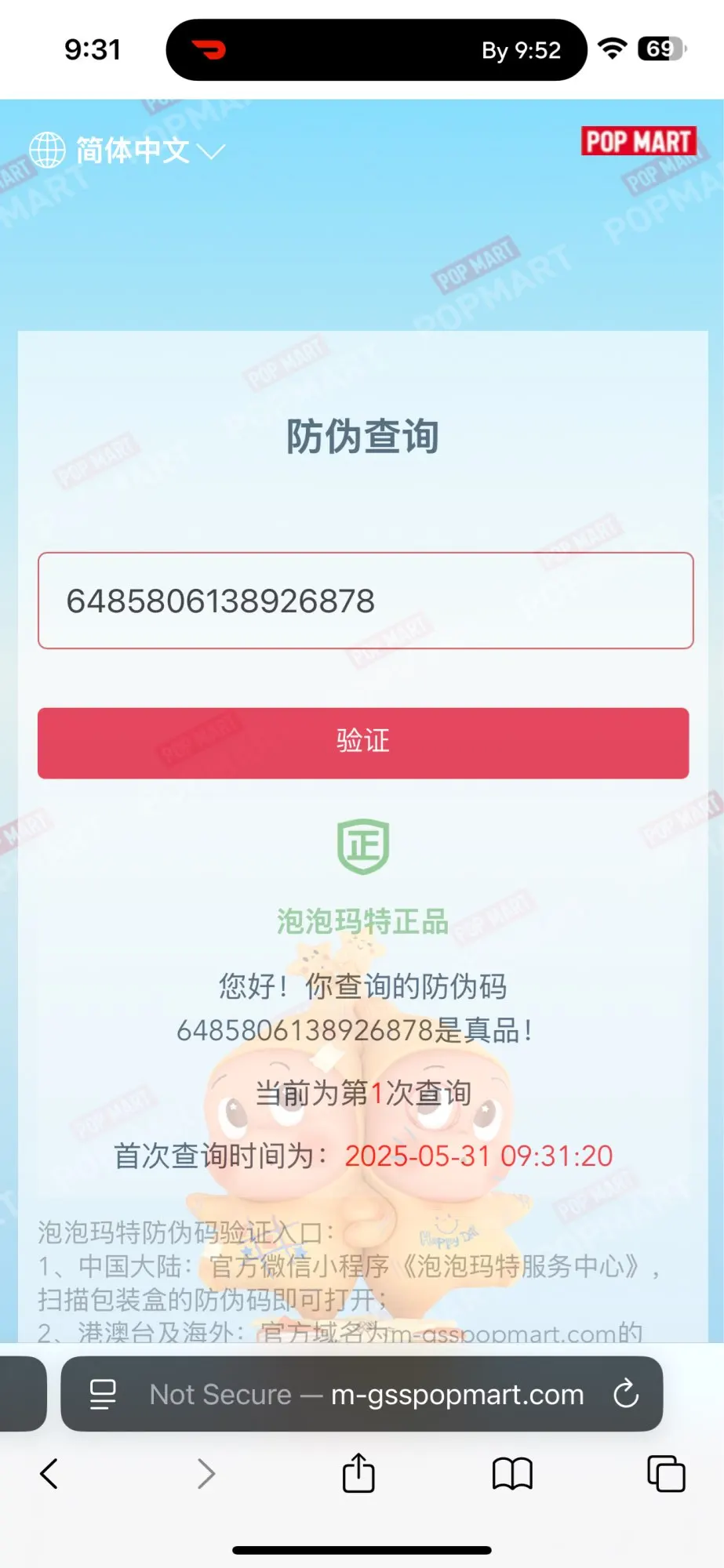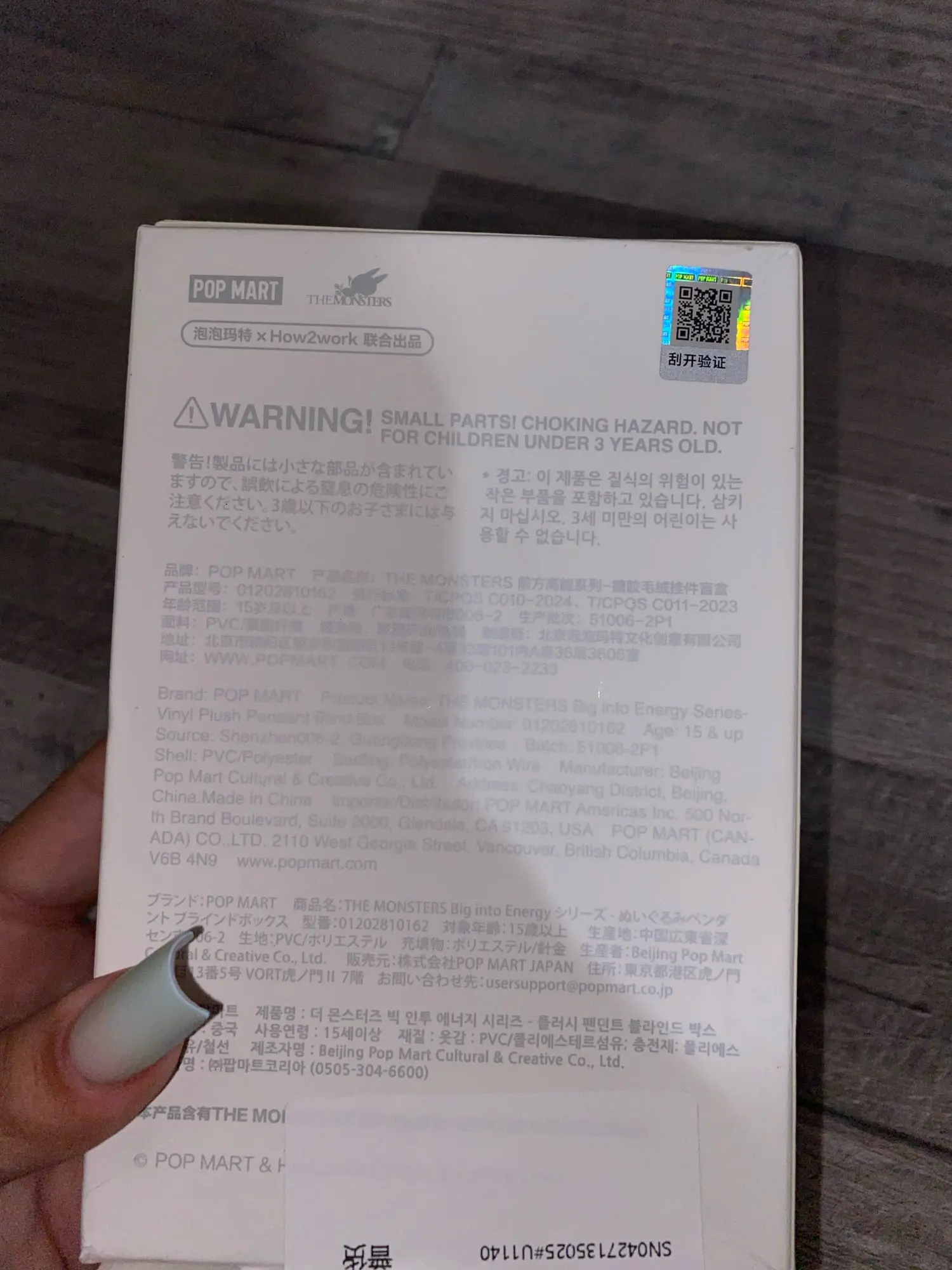 Genuine Pop Mart Labubu with QR code to verify authenticity through the Pop Mart website.